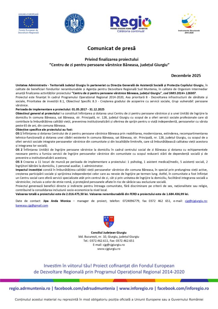 GENERALComunicat de presă privind finalizarea proiectului ”Centru de zi pentru persoane vârstnice Băneasa, județul Giurgiu admin2 days ago01 mins Post navigation Previous: Escrocheria cu locuri de muncă se răspândește rapid. Cum sunt înșelați oamenii care își caută serviciu?