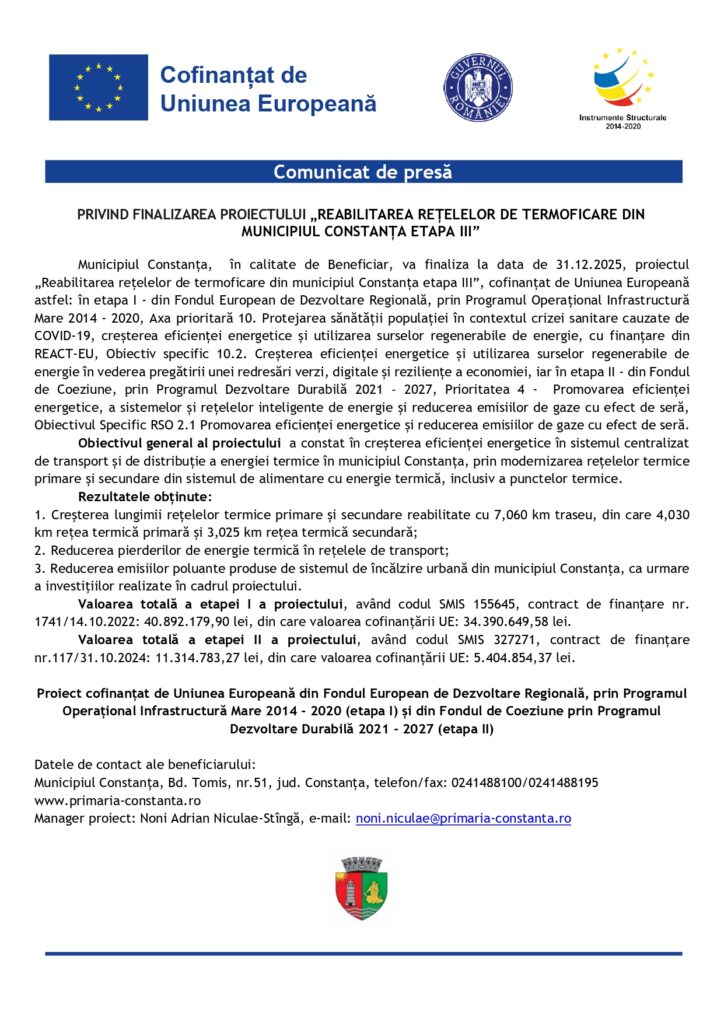 GENERALCOMUNICAT PRIVIND FINALIZAREA PROIECTULUI „REABILITAREA REȚELELOR DE TERMOFICARE DIN MUNICIPIUL CONSTANȚA ETAPA III” admin1 hour ago01 mins Post navigation Previous: Prețul energiei electrice va crește din nou în 2026. Ce taxă se va majora